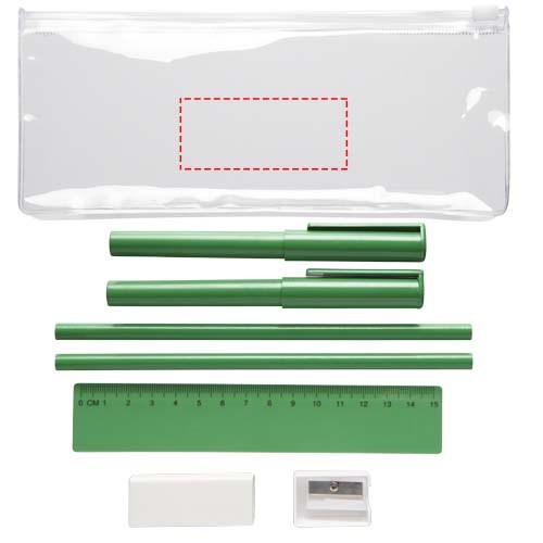 PVC-Federmäppchen mit 2 Kugelschreibern (einer mit schwarzer Tinte, der andere mit blauer), 2 Bleistiften, einem Lineal, einem Anspitzer und einem Radiergummi.