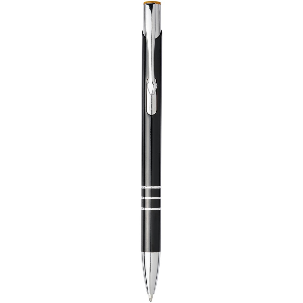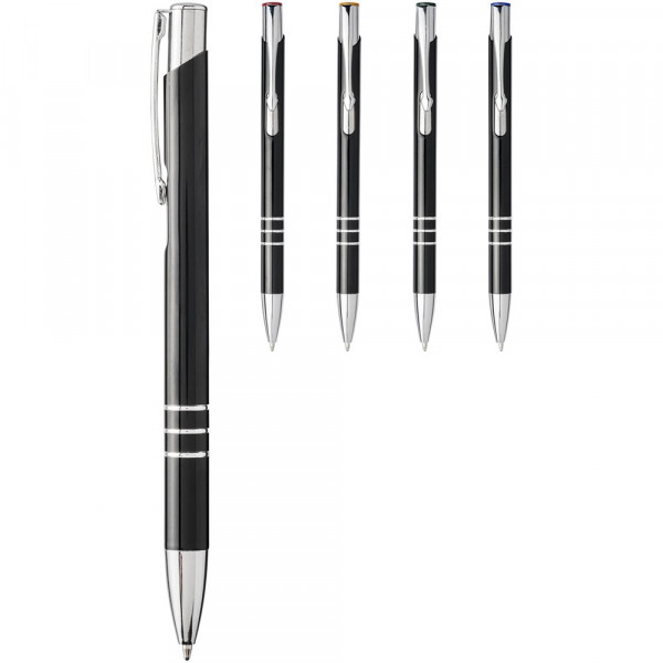 Kugelschreiber mit schwarzem Schaft und Klickmechanismus in verschiedenen Farben oben am Stift. Bei der Lasergravur ist die Farbe darunter sichtbar, passend zur Farbe oben am Stift. Der Stift hat einen Metallclip, einen Aluminiumschaft und eine ABS-Spitze und -Oberseite. Das umfangreiche und beliebte Moneta-Sortiment ist in vielen verschiedenen Stilen und Ausführungen erhältlich.