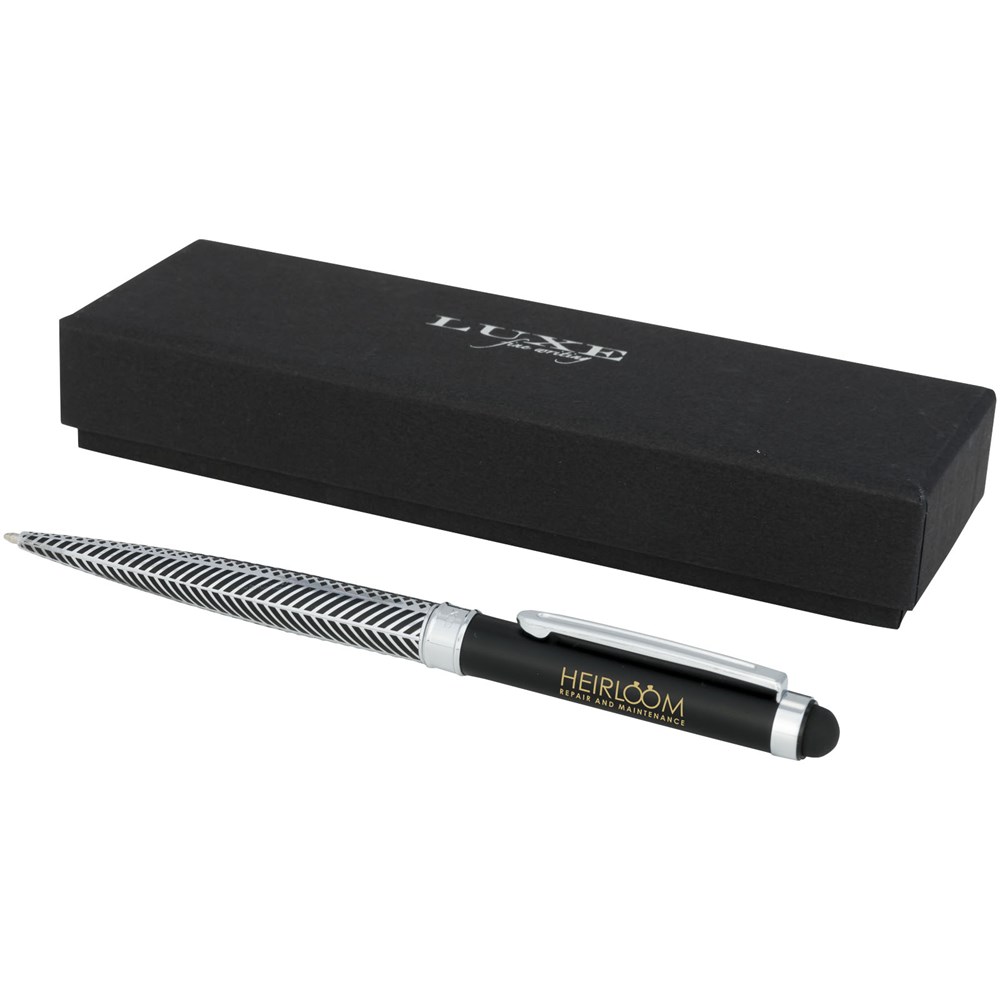 Der Stylus Kugelschreiber hat ein exklusives Design, mit einem stilvoll gemusterten unteren Gehäuse. Inkl. hochwertiger blauer Premium-Tinte zum Nachfüllen und verpackt in einer Geschenkbox von LUXE (16,5 x 4,5 x 2,8 cm).