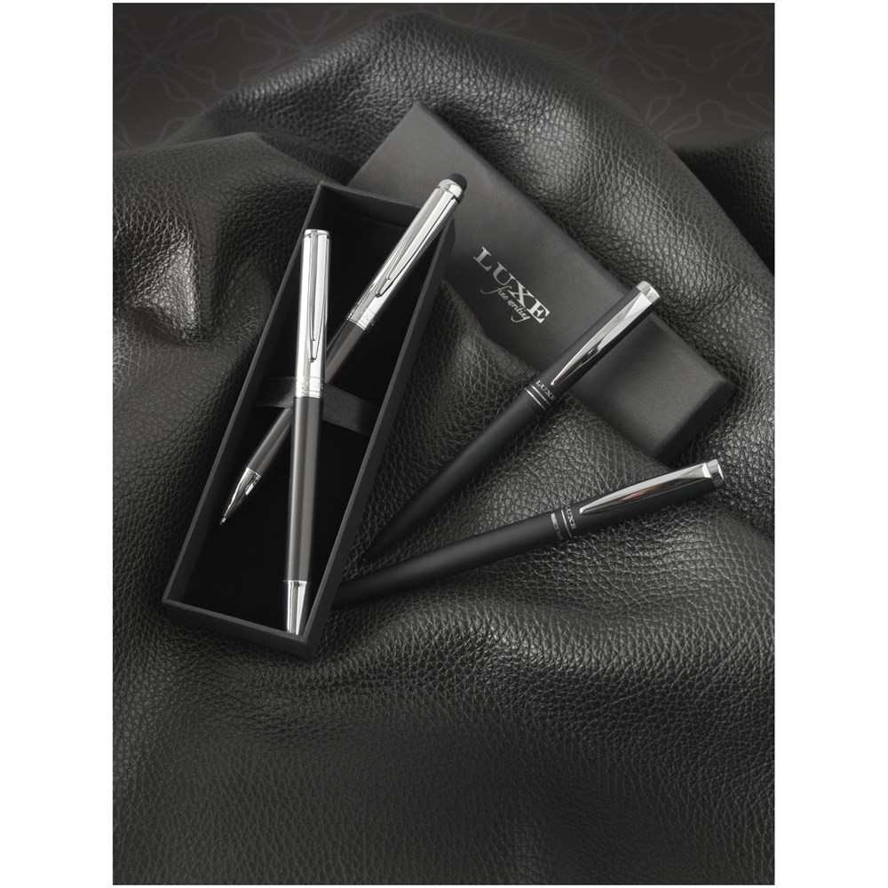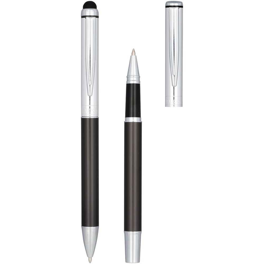 Stiftset im exklusiven Design mit einem Stylus-Kugelschreiber und einem Rollerball-Stift. Beide Stifte verfügen über einen unteren Schaft aus Graphit, der durch einen polierten verchromten oberen Schaft ergänzt wird. Mit schwarzer Premium-Mine und gummierte Stylus-Spitze, ideal für Touchscreens wie Tablets und Smartphones. Verpackt in einem „LUXE“-Geschenkkarton (17 x 5,5 x 3 cm).