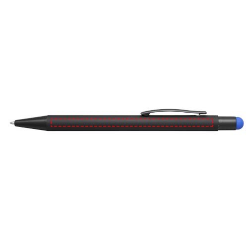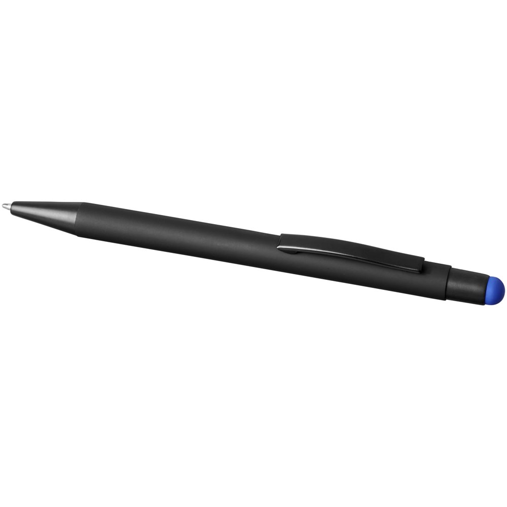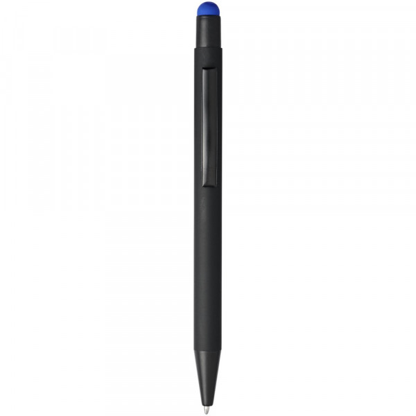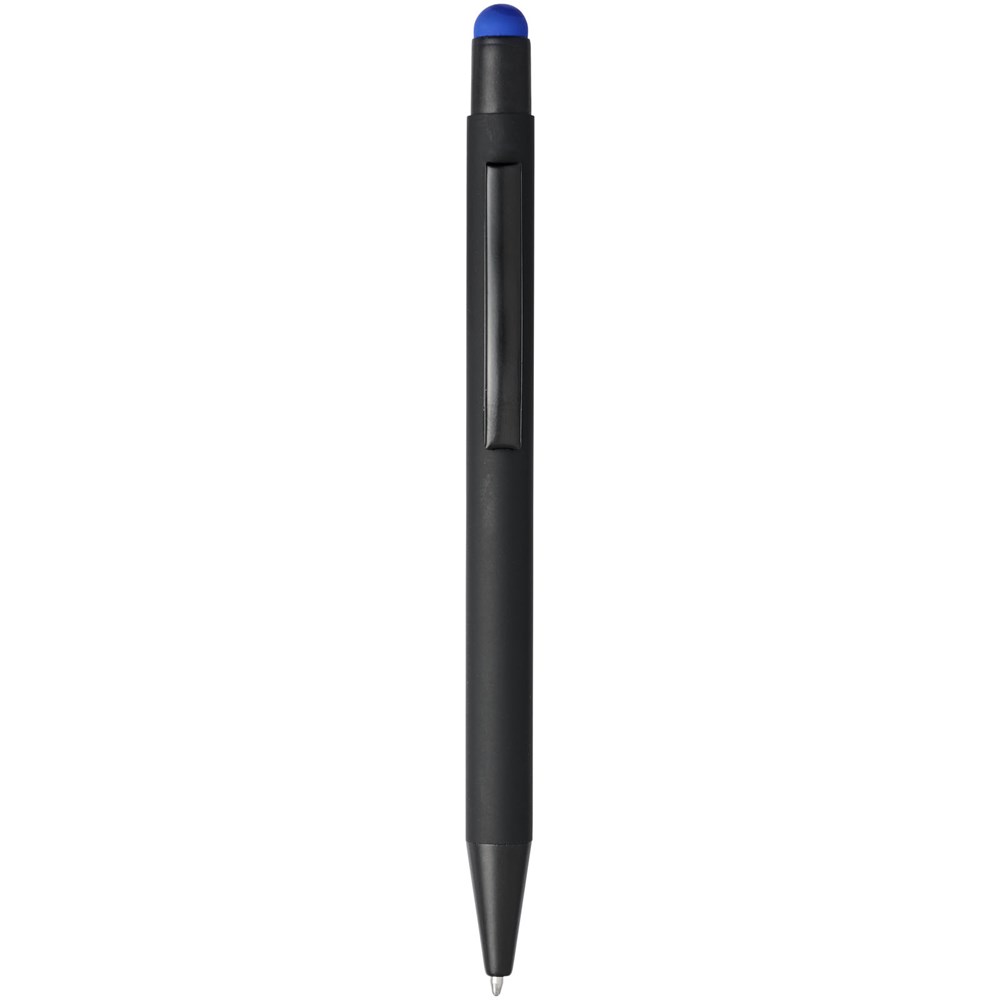 Gummierter Stylus-Kugelschreiber mit Klickmechanismus. Die Farbe der Stylusspitze entspricht der lasergravierten Unterschicht des Stiftes. Der Stift hat einen Metallclip und einen Gummi-Eingabestift und ist aus Aluminium gefertigt. Schreiblänge: 450 m.