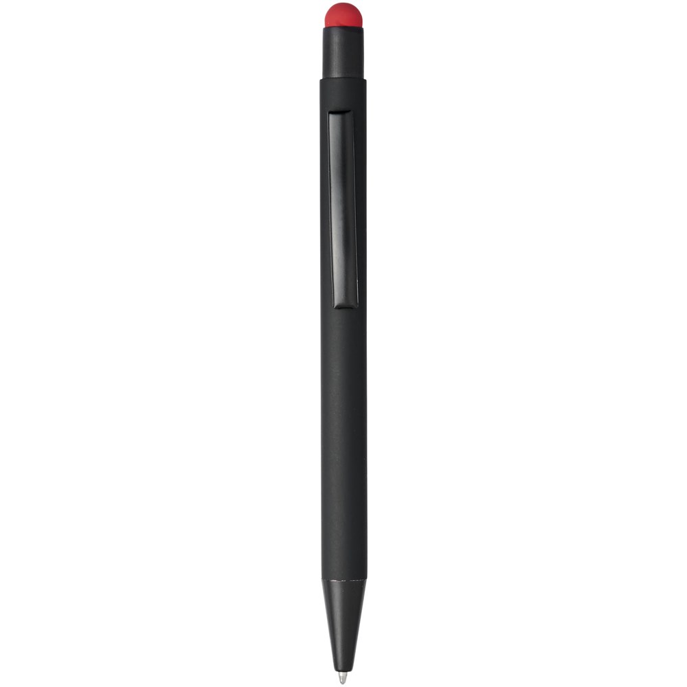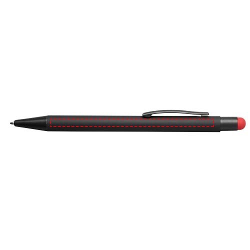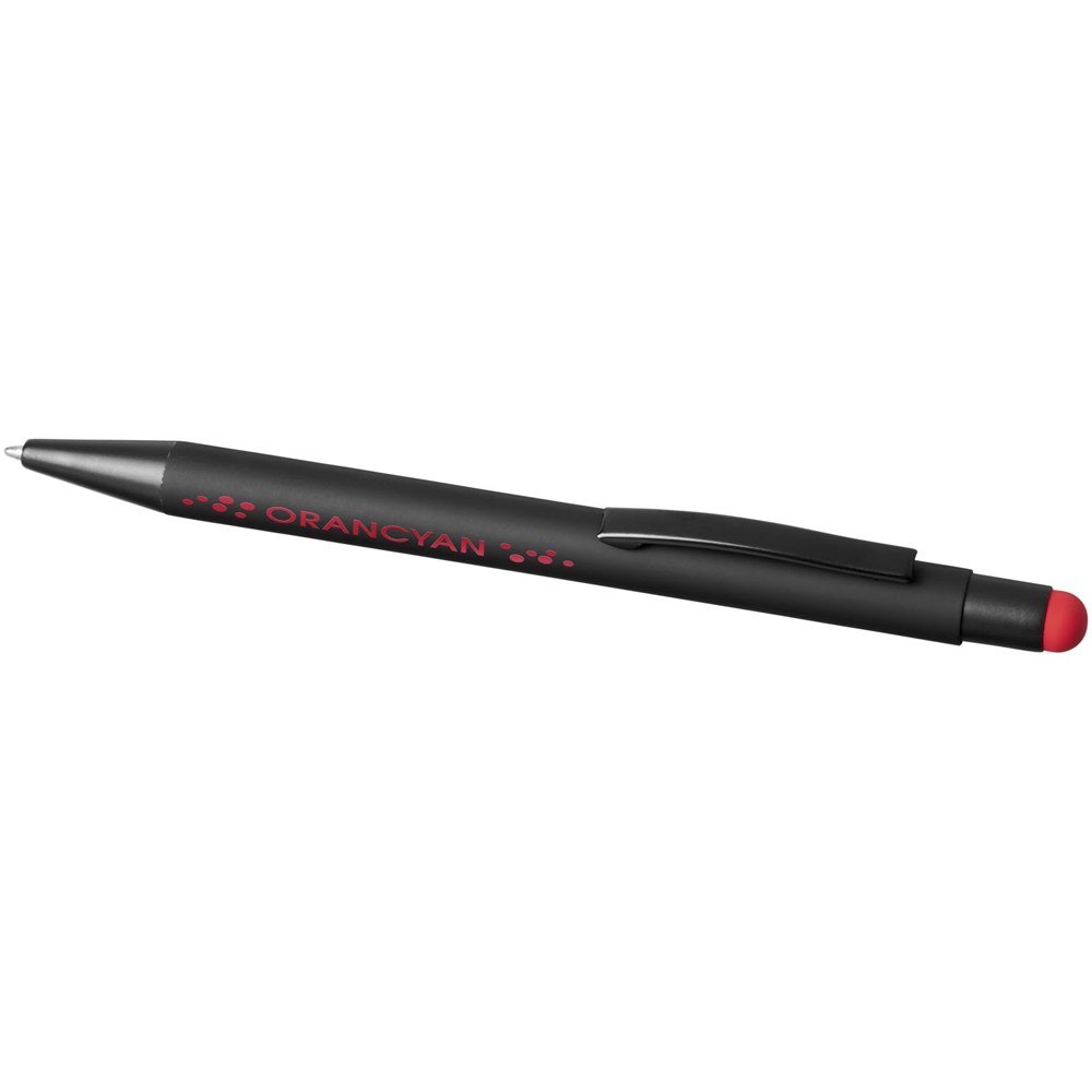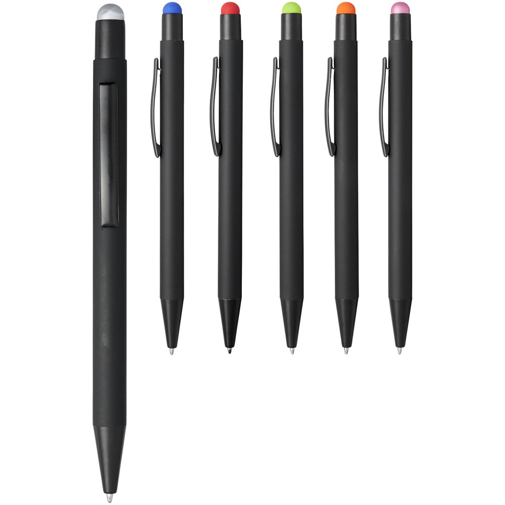 Gummierter Stylus-Kugelschreiber mit Klickmechanismus. Die Farbe der Stylusspitze entspricht der lasergravierten Unterschicht des Stiftes. Der Stift hat einen Metallclip und einen Gummi-Eingabestift und ist aus Aluminium gefertigt. Schreiblänge: 450 m.