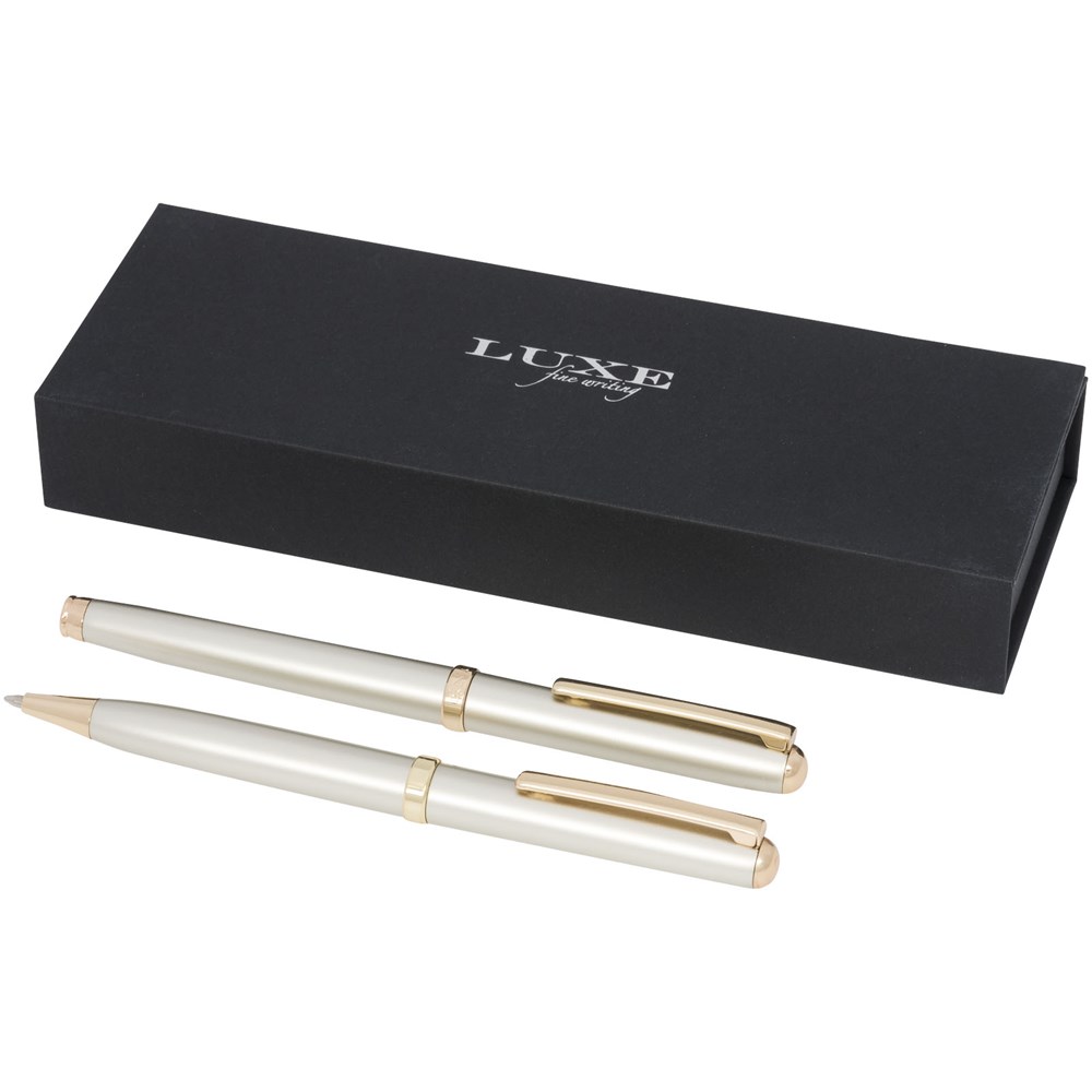 Ein modernes Schreibset bestehend aus einem Drehkugelschreiber und einem Kappentintenroller, das in einer Luxe-Geschenkbox geliefert wird. Alles mit einem mattgoldenen Schaft und glänzenden goldenen Teilen. Inklusive einer Premium-Nachfüllmine für beide Stifte. Oberer Teil des Schafts mit goldfarbener Unterschicht. Kugelschreibergröße: 13,4 x 1,05 cm, Gewicht: 23 g, Schreiblänge: 800 m. Tintenrollergröße: 13,5 x 1,05 cm, Gewicht: 23 g, Schreiblänge: 400 m.