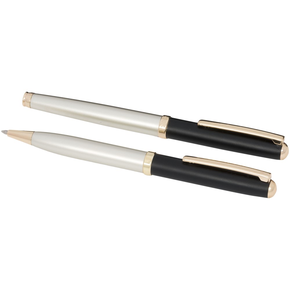 Ein modernes Schreibset bestehend aus einem Drehkugelschreiber und einem Kappentintenroller, das... mehr