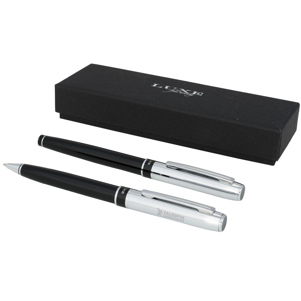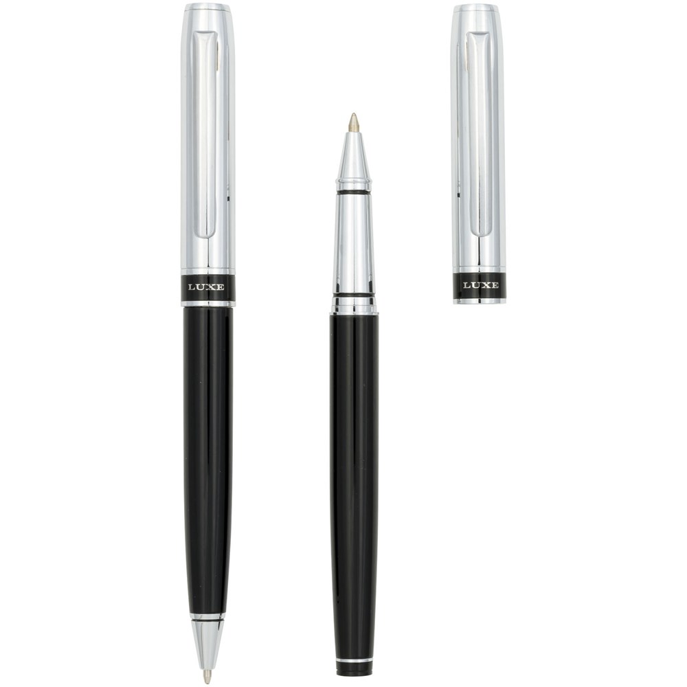 Geschenkset mit Kugelschreiber und Rollerball-Stift im exklusiven Design. Mit schwarzer Premium-Mine und in einem „LUXE“-Geschenkkarton verpackt (17 x 5,5 x 3 cm).