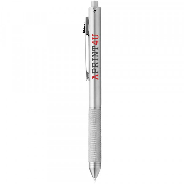 Kugelschreiber mit Klickmechanismus sowie schwarzer und roter Mine, Druckbleistift, orangefarbener Marker und strukturierter Griff.