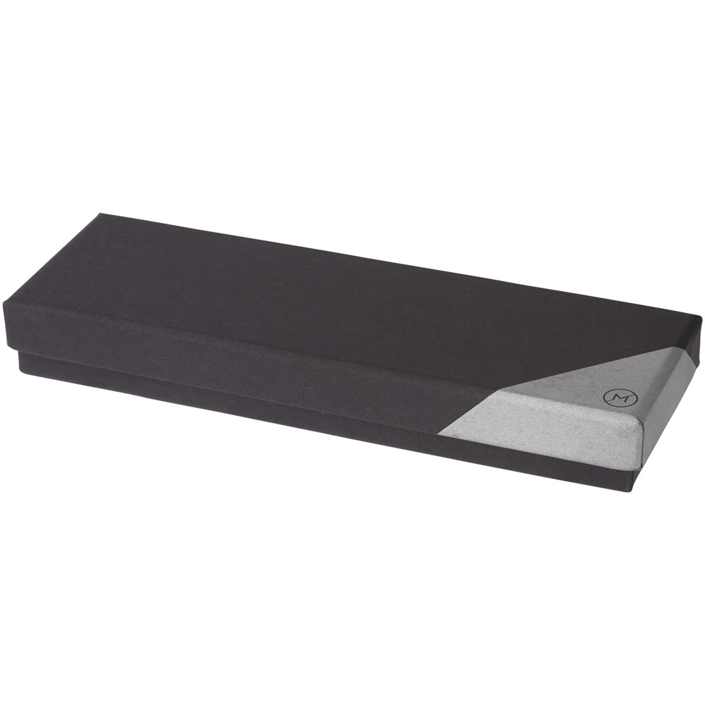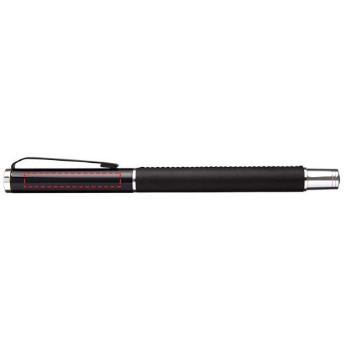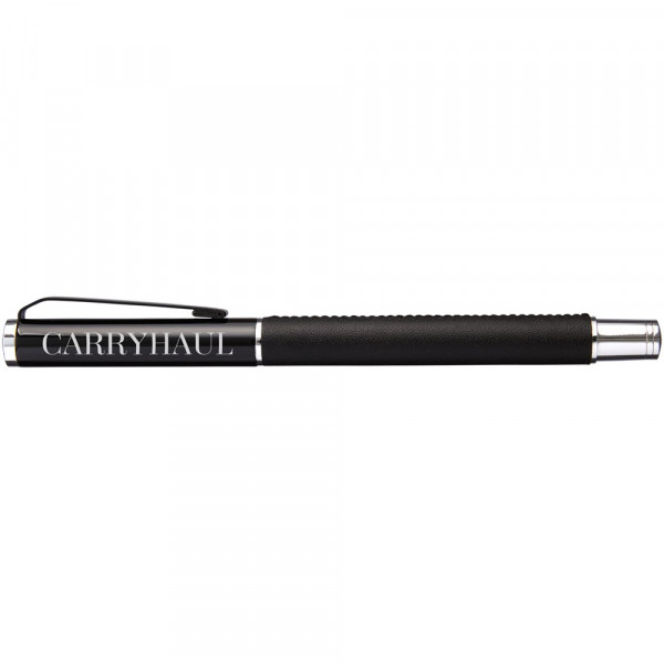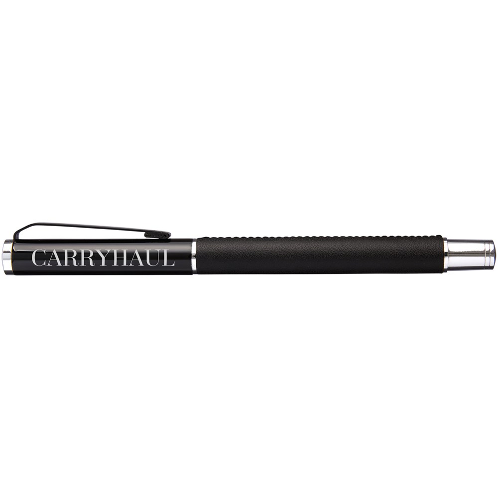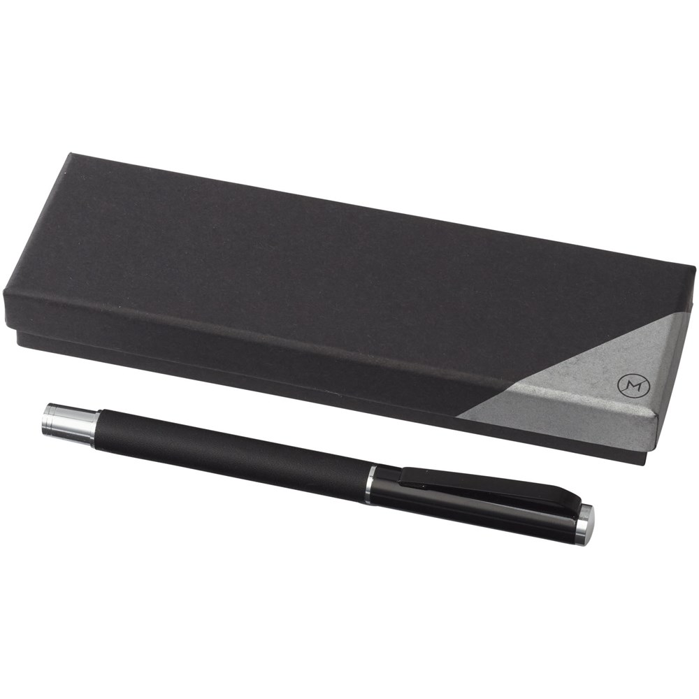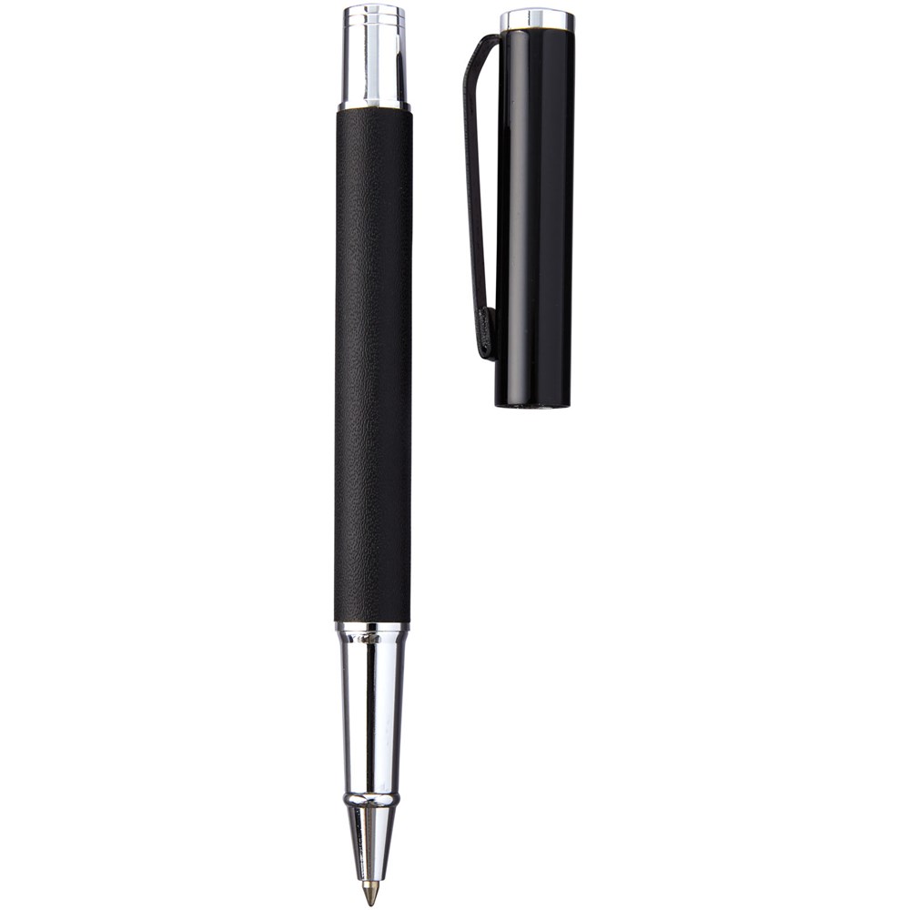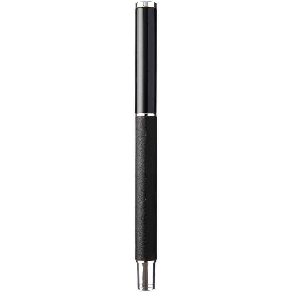 Tintenroller im exklusiven Design. In PU-Leder gewickelter unterer Schaft mit matt-schwarzem oberen Schaft und Chrom-Akzenten. Stift enthält eine schwarze Premium-Rollerball-Tintenpatrone. In einer zweiteiligen Geschenkbox von Marksman® verpackt.