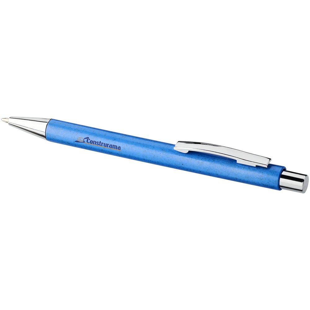 Eleganter, klassischer Kugelschreiber mit Klickmechanismus, mit Schaft aus Weizenstroh und markanten chromfarbenen Details. Bei Weizenstroh handelt es sich um zurückgebliebene Stiele nach der Ernte von Weizenkörnern, was die Menge an Kunststoff reduziert.