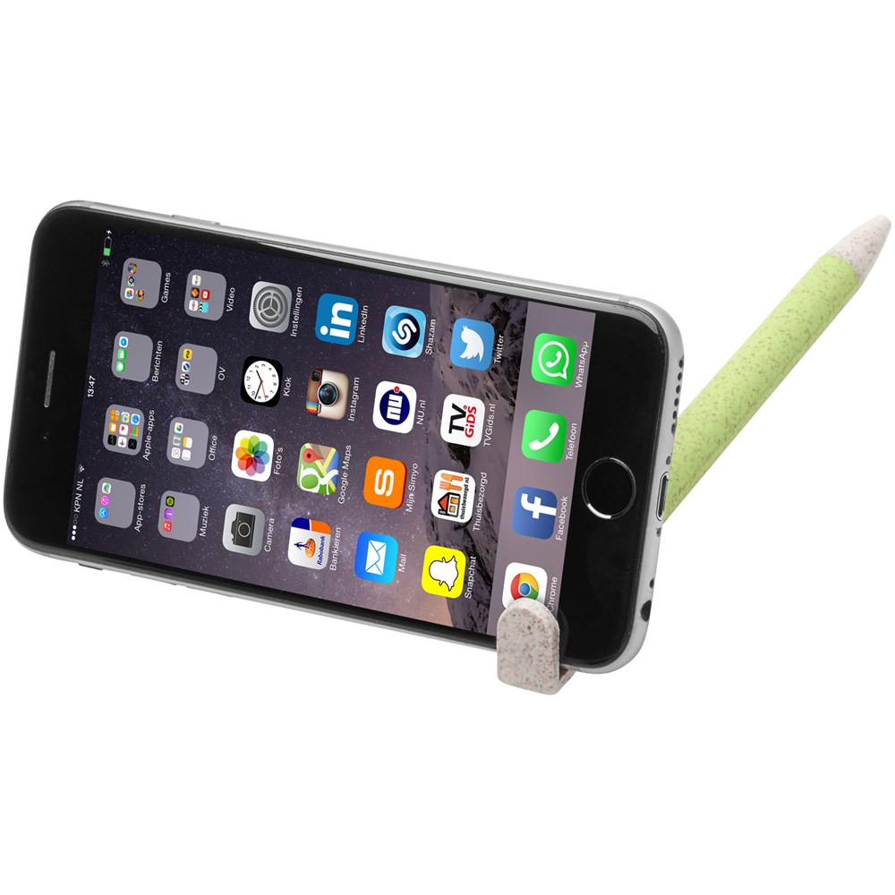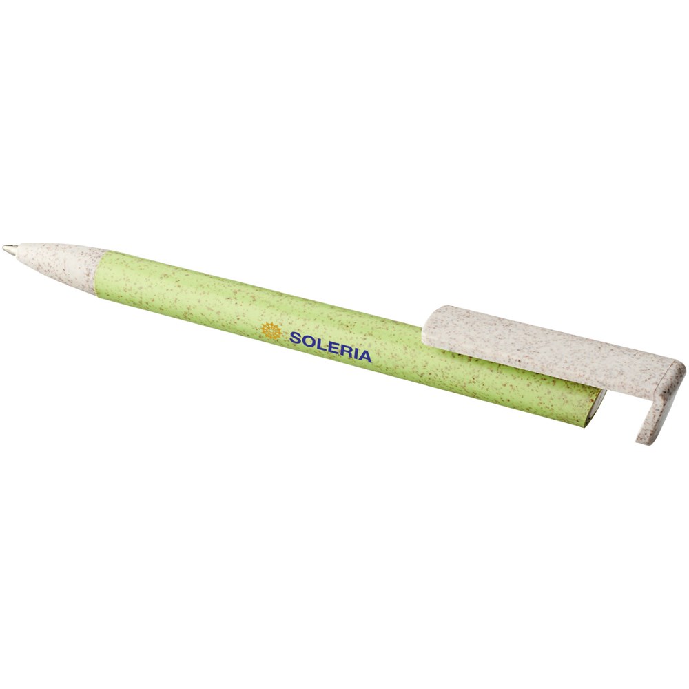 Kugelschreiber mit Klickmechanismus aus Weizenstroh. Bei Weizenstroh handelt es sich um zurückgebliebene Stiele nach der Ernte von Weizenkörnern, was die Menge an Kunststoff reduziert. Der obere Teil des Stifts dient gleichzeitig als Halterung für Smartphones zum einfachen Freisprechen.