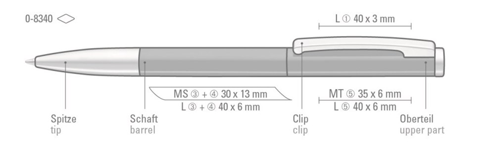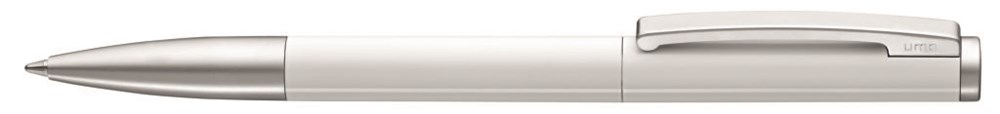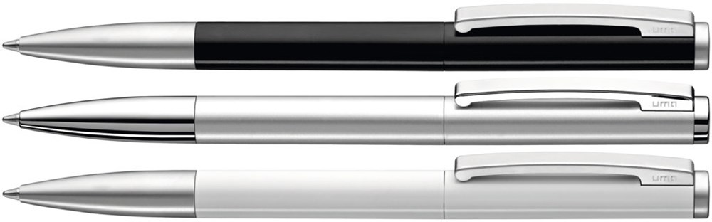 Metall-Drehkugelschreiber mit gefedertem Clip. Oberfläche in silber matt und glänzenden Beschlagteilen, schwarz oder weiß glänzend mit matten Beschlägen. Minentype: uma Economy Class Refill Minenfarbe: blau