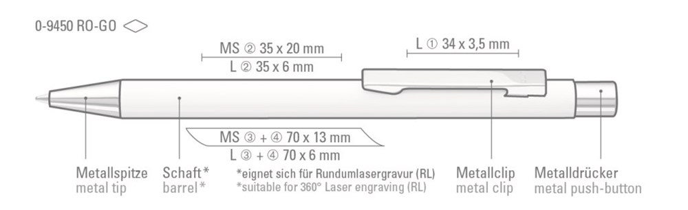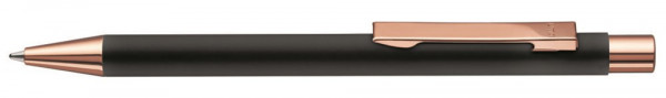 Metall-Druckkugelschreiber mit Schaft in weiß glänzend oder matt schwarz, Metallspitze, Metallclip und Drücker in roségold glänzend. Minentype: uma Tech Refill 1.0, schwarzes Rohr Minenfarbe: blau