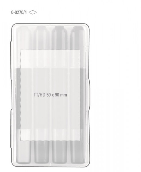 Flüssig-Textmarkerset bestehend aus 4 LIQEO HIGHLIGHTER PEN in einer klar transparenten Kunststoffverpackung. Standardfarben der Textmarker in gelb, grün, magenta und blau. Optional wählbare Textmarkerfarben: orange und violett.