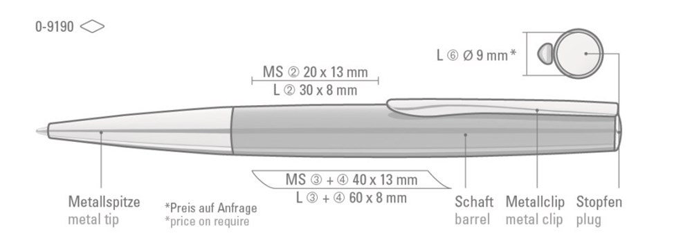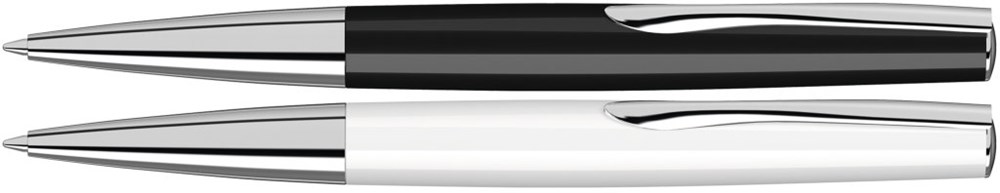 Metall-Drehkugelschreiber mit gedeckt glänzendem Gehäuse in schwarz oder weiß, gefederter Metallclip und schwere Metallspitze glanzverchromt.