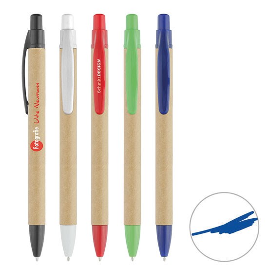 mit Schaft aus naturfarbenem Karton und farbigen Kunststoff Applikationen, Mine X-20, blau schreibend