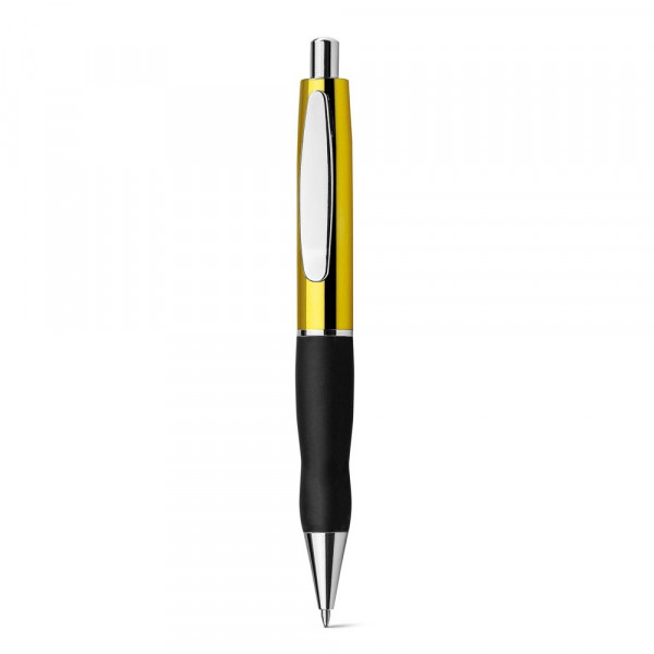 Kugelschreiber mit blauschreibender Mine, metallischer Oberfläche, Metallclip und Gummigriff. ø14 x 137 mm
