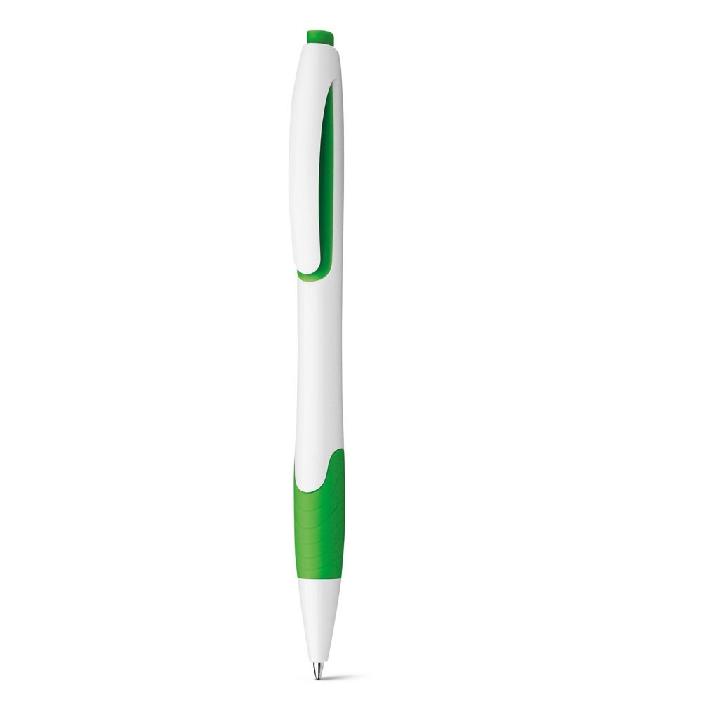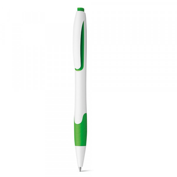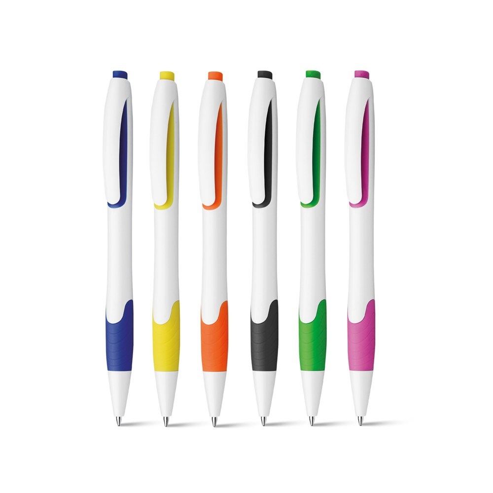 Kunststoffkugelschreiber mit Gummigrip und blauschreibender Mine. Spitzdicke 0.7 mm, niedrige Viskosität. ø11 x 140 mm