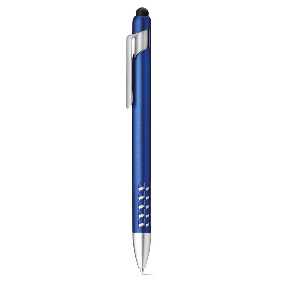 Kugelschreiber mit Touchpen-Funktion und Smartphonehalter. Strukturierte silberne Details an der Spitze. ø11 x 143 mm