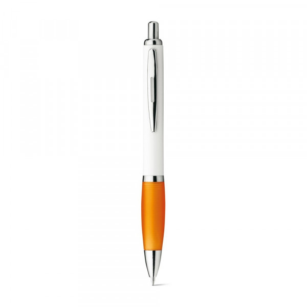 Kugelschreiber aus Kunststoff mit blauschreibender Mine, einem farbigen Gummigriff, weissen Körper und einem Metallclip. ø13 x 140 mm
