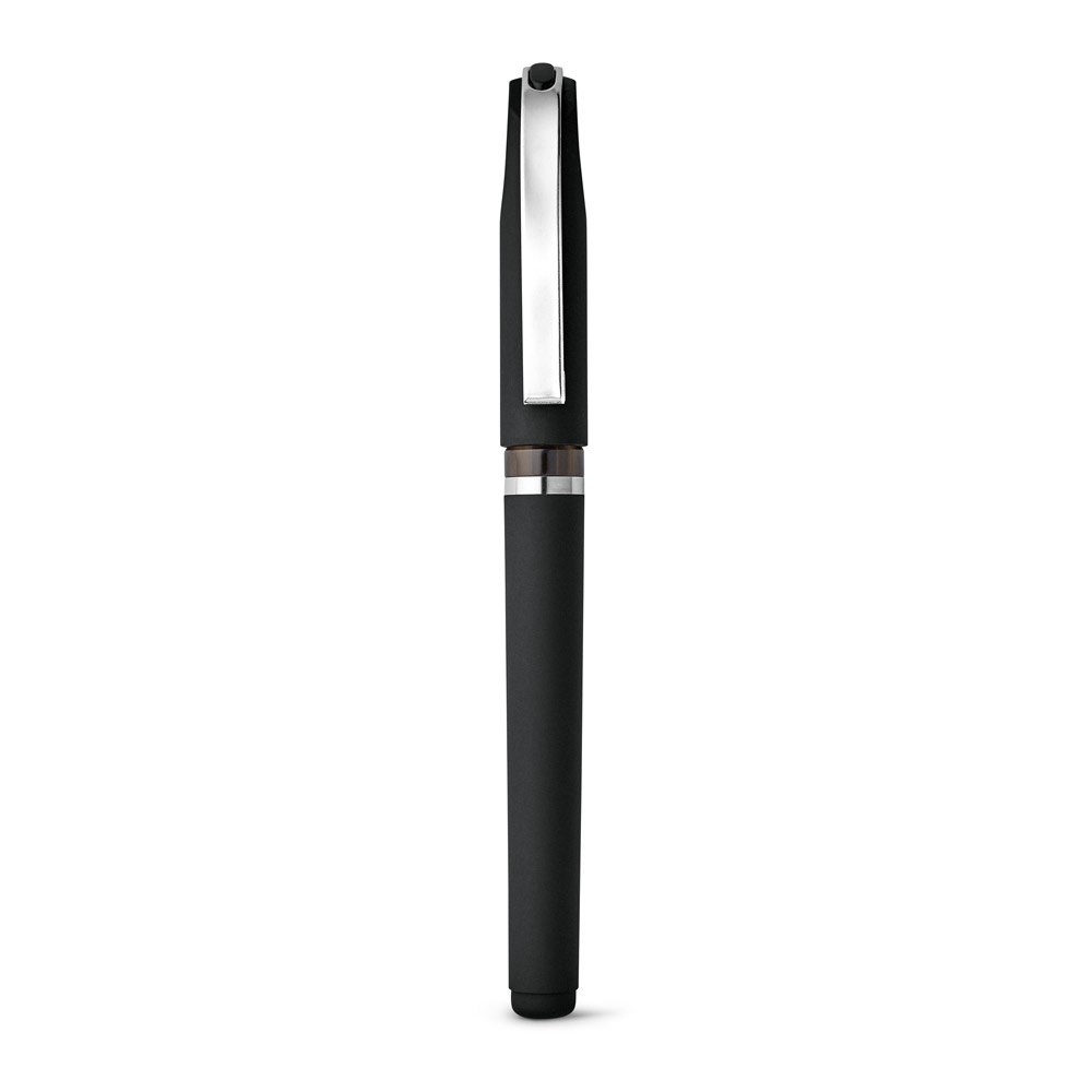 Kugelschreiber aus ABS mit schwarzschreibender Mine, Kappe, Metallclip und gummierter Oberfläche. Inklusive Gel-Nachfüllung. ø12 x 140 mm