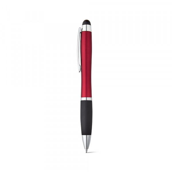 Kugelschreiber mit Drehmechanismus , Clip aus Metall, Gummigriff und Touchpen-Funktion. Veredelung mit Hintergrundbeleuchtung – LED-Effekt durch betätigen des Druckknopfes. Beinhaltet drei AG3-Batterien. ø11 x 135 mm
