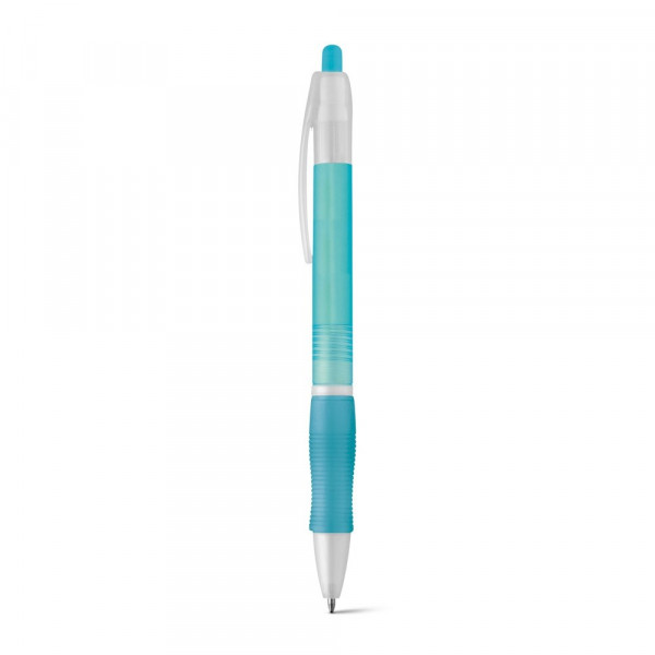 Kugelschreiber transparent mit schwarzschreibender Mine, Clip und Gummigriff. ø10 x 145 mm