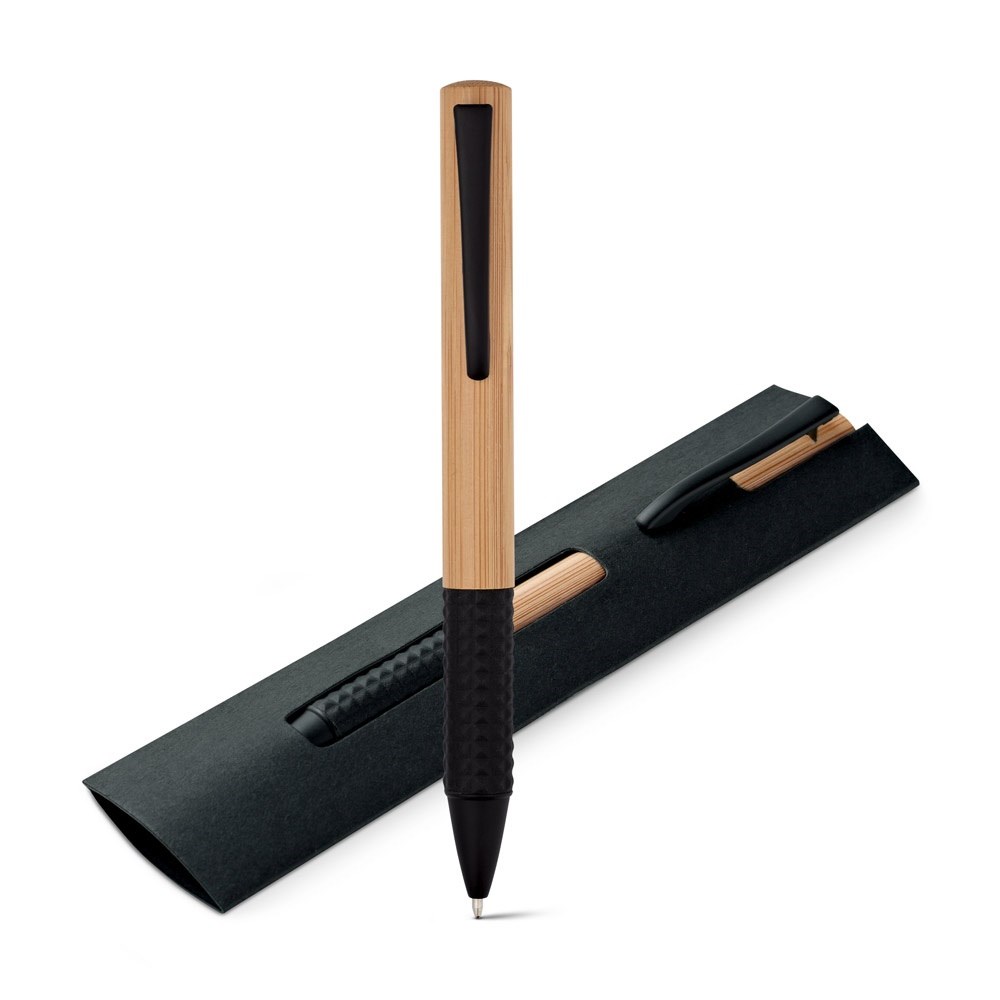 Kugelschreiber aus Bambus mit Drehmechanismus, Clip aus Metall und Gummigriff. Geliefert mit einem Geschenketui aus Karton. ø12 x 140 mm | Etui: 155 x 40 mm
