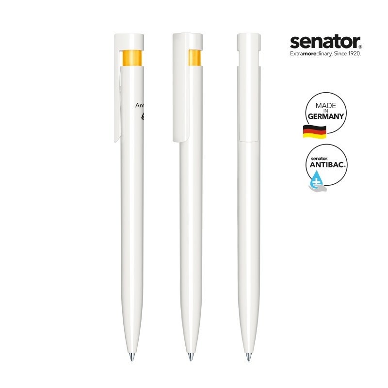 senator® Liberty Polished Basic Antibac Druckkugelschreiber mit antibakteriell und antiviral wirkender Oberfläche. Mit Silberverbindungen dotierter Kunststoff aus Deutschland, antibakterielle Wirkung bestätigt durch Prüfung nach ISO 22196, antivirale Wirkung nach ISO 21702. Poliert opake Gehäuseoberfläche, weißer Schaft, farbig transparentes Zwischenstück, langlebige senator® magic flow G2 Mine 1,0 mm, Schreiblänge bis zu 5.000 m, Schreibfarbe: Schwarz