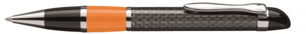 Edler Carbonfaser-Drehkugel- schreiber mit flexiblem, glanzverchromtem Metallclip, Metallzierringen, Metallspitze und farbiger Griffzone.