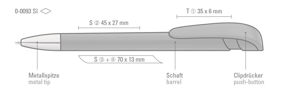 Druckkugelschreiber mit gedeckt glänzendem Gehäuse, schwerer Metallspitze glanzverchromt und breitem Bogenclipdrücker.