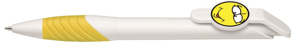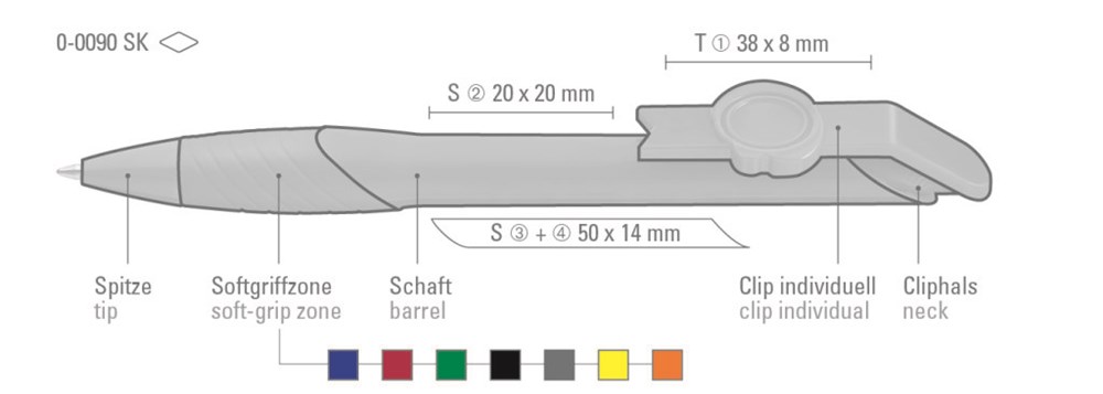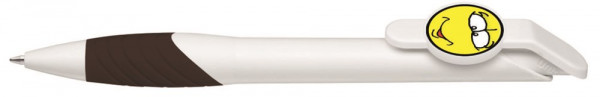 Druckkugelschreiber mit individuell gestaltbarem Clipdrücker. Gehäuse gedeckt, mit ergonomischer Gummigriffzone. Motivgröße nach Absprache; max.: ca. 30 x 20 x 2,2mm Minentype: uma Tech Refill 1.0, schwarzes Rohr Minenfarbe: schwarz
