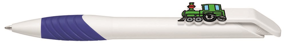 Druckkugelschreiber mit individuell gestaltbarem Clipdrücker. Gehäuse gedeckt, mit ergonomischer Gummigriffzone. Motivgröße nach Absprache; max.: ca. 30 x 20 x 2,2mm