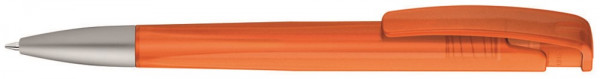 Druckkugelschreiber mit geometrisch wechselnder Schaftform, transparent gefrostetem Gehäuse und Metallspitze matt verchromt.