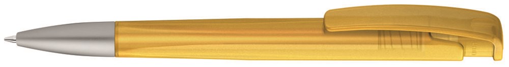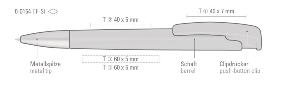 Druckkugelschreiber mit geometrisch wechselnder Schaftform, transparent gefrostetem Gehäuse und Metallspitze matt verchromt.