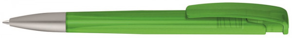 Druckkugelschreiber mit geometrisch wechselnder Schaftform, transparent gefrostetem Gehäuse und Metallspitze matt verchromt.