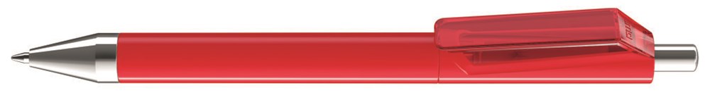 Druckkugelschreiber mit gedeckt glänzendem Gehäuse, farbig transparent glänzendem Innenschaft und Clip. Spitze und Drücker in silber glänzend.