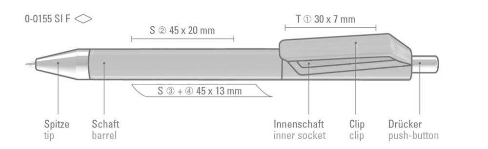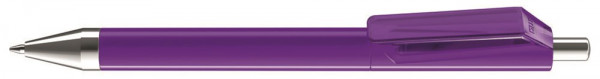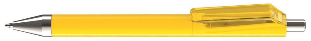 Druckkugelschreiber mit gedeckt glänzendem Gehäuse, farbig transparent glänzendem Innenschaft und Clip. Spitze und Drücker in silber glänzend.