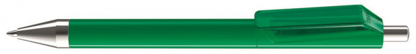 Druckkugelschreiber mit gedeckt glänzendem Gehäuse, farbig transparent glänzendem Innenschaft und Clip. Spitze und Drücker in silber glänzend.