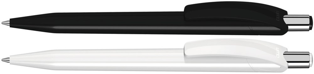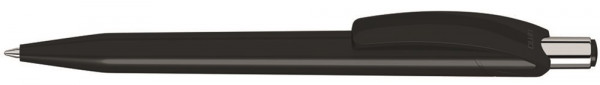 Druckkugelschreiber mit glänzend gedecktem Gehäuse und Drückerstopfen. Drücker in silber glänzend.