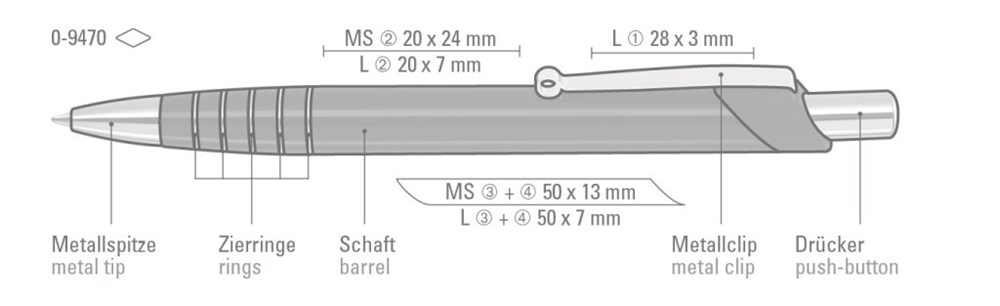 Metalldruckkugelschreiber mit silbernen Zierringen im Schaft, elastischer Metallclip. Spitze und Drücker in silber glänzend.