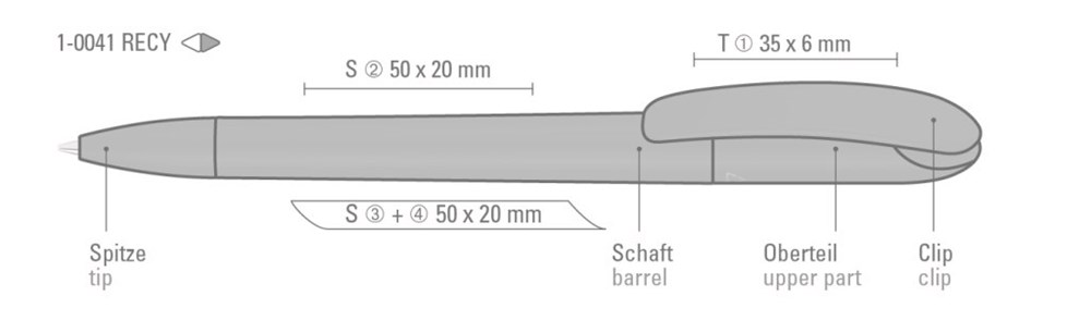 Drehkugelschreiber unifarben mit gedeckt mattem Gehäuse aus 100% recyceltem Post-Consumer Kunststoff. Die Modelle sind mit Recyclingzeichen gekennzeichnet. Aufgrund der Besonderheit des Materials (Post-Consumer Recycled Plastic) sind produktionstechnische Farbschwankungen gegeben.
