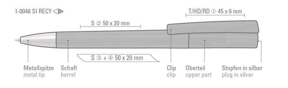 Drehkugelschreiber unifarben mit gedeckt mattem Schaft aus 100% recyceltem Post-Consumer-Kunststoff. Die Modelle sind mit Recycling-Zeichen gekennzeichnet. Stopfen optional in verschiedenen matt gedeckten Farben oder silber (Standard ABS) erhältlich. Aufgrund der Besonderheit des Materials (Post-Consumer Recycled Plastic) sind produktionstechnische Farbschwankungen gegeben. BlackForestPen – Designed in Deutschland, gefertigt in der Schweiz, zusammengefügt und veredelt im Schwarzwald. Minentype: uma Tech Refill 1.0, schwarzes Rohr Minenfarbe: blau