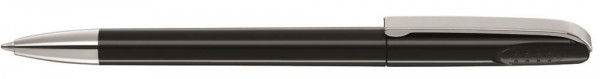 Drehkugelschreiber mit glänzend gedecktem Gehäuse, schwerer glänzender Metallspitze und Metallclip. Griffnoppen in der Kappe unterstützen den komfortablen Drehmechanismus. Minentype: uma Tech Refill 1.0, schwarzes Rohr Minenfarbe: schwarz