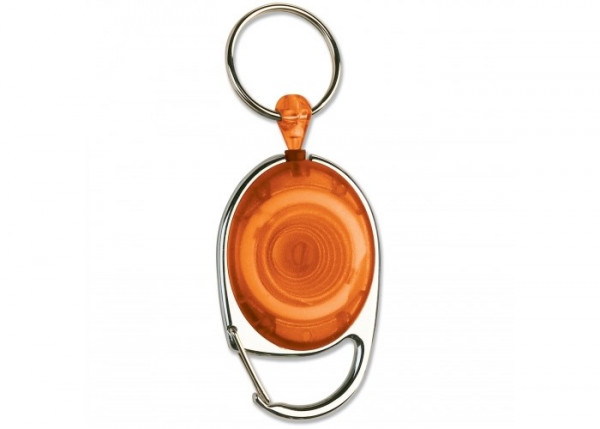 Gefrosteter Namensschildhalter mit Ausziehband (60cm) und Karabinerhaken. Werbeanbringung mittels Tampondruck.