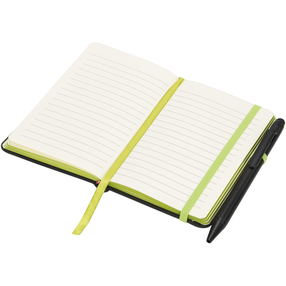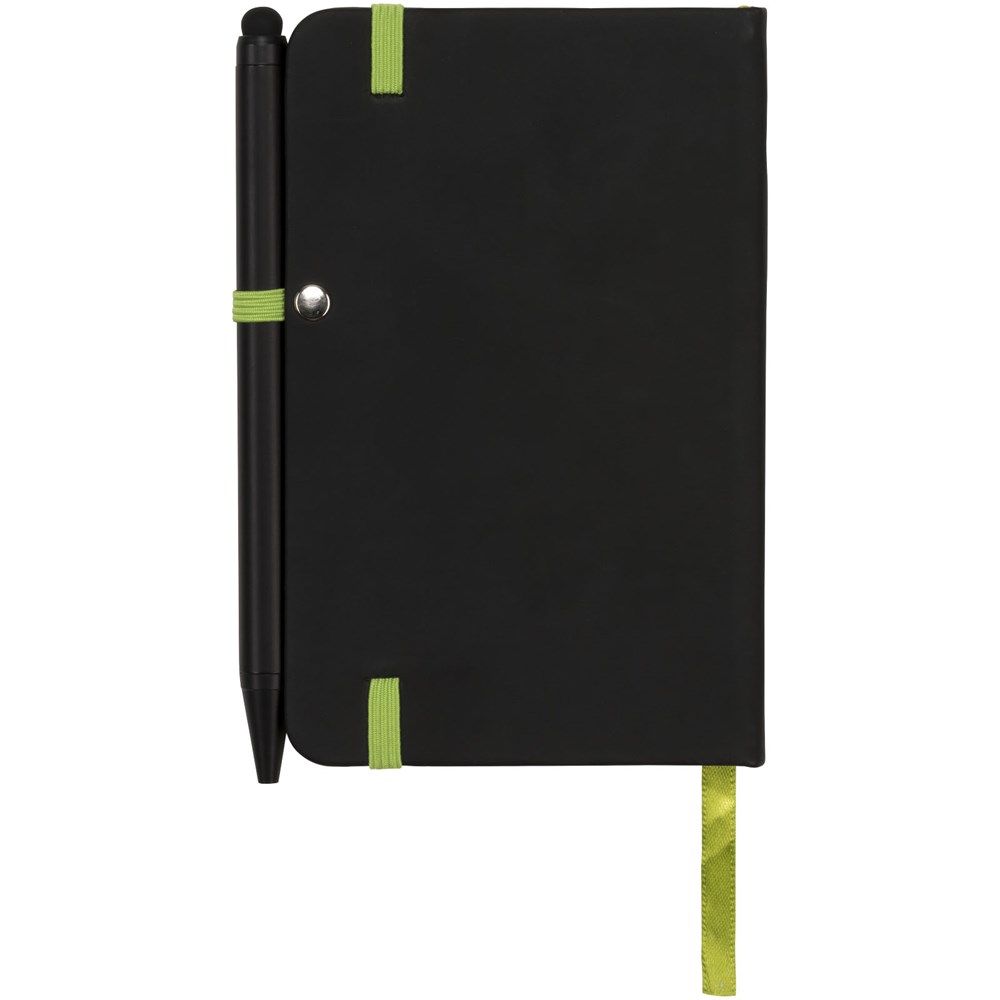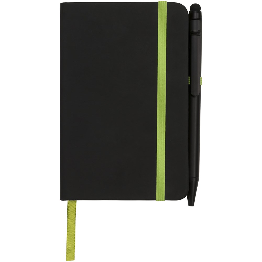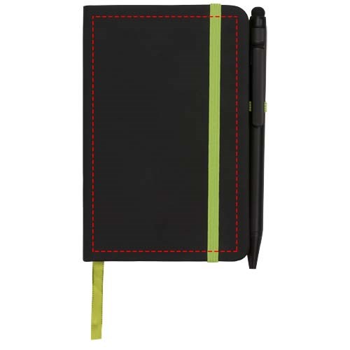 Modernes und elegantes schwarzes Notizbuch mit Einband mit weicher Haptik. Wird mit farbigem Rand und Seitenmarkierung in passender Farbe, Stiftschlaufe und Verschlussriemen geliefert. Wird mit einem einfarbig schwarzen Stylus-Kugelschreiber geliefert. Mit 96 Blatt (70 g/m²) cremefarbigem liniertem Papier.