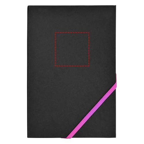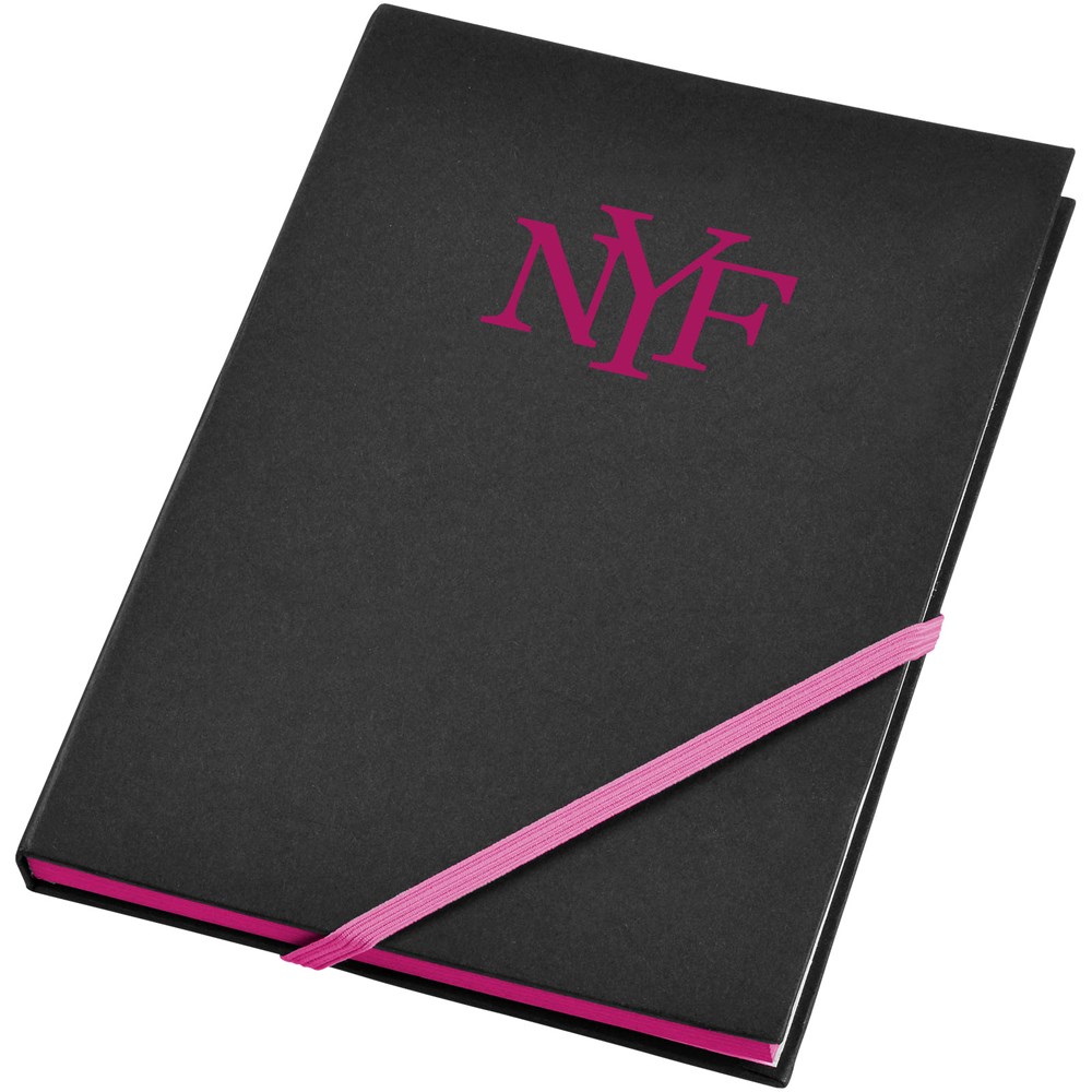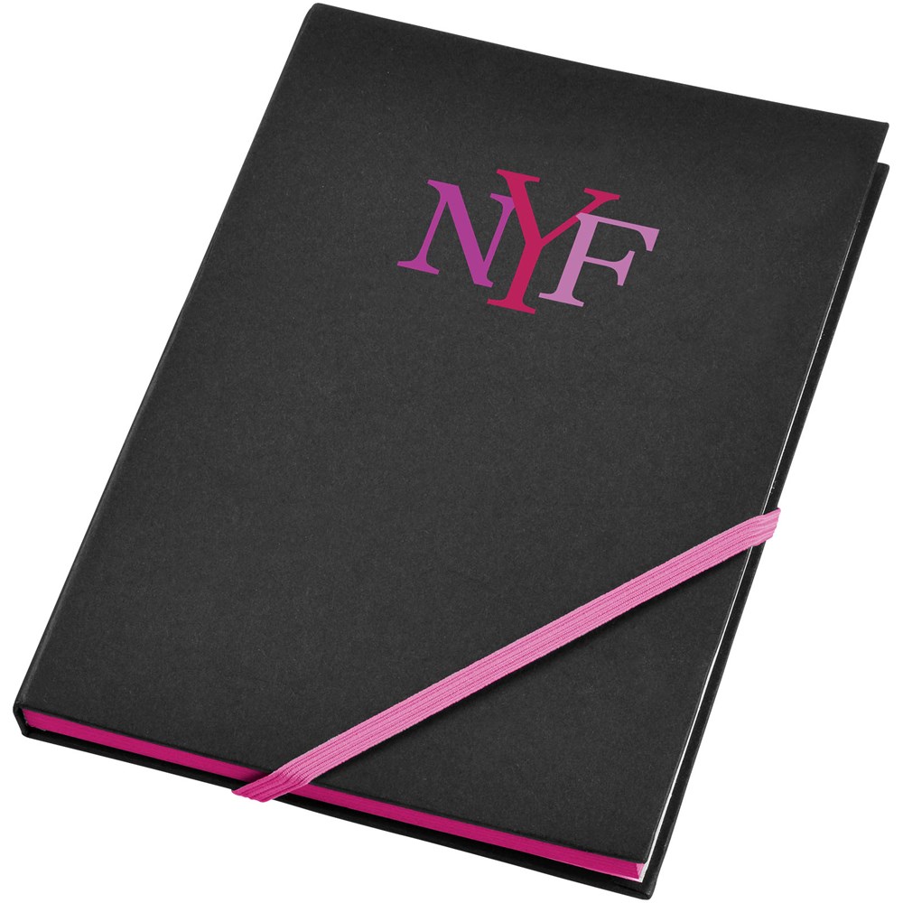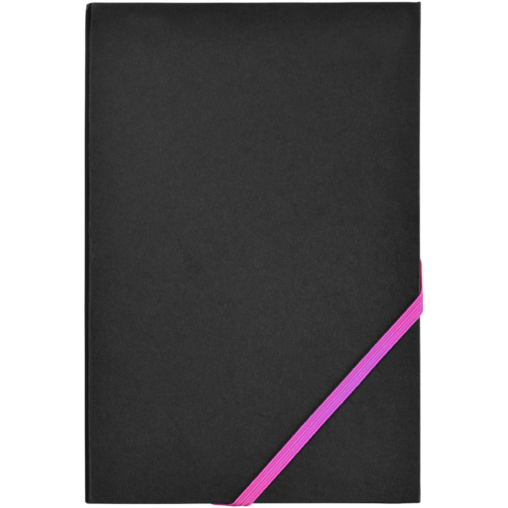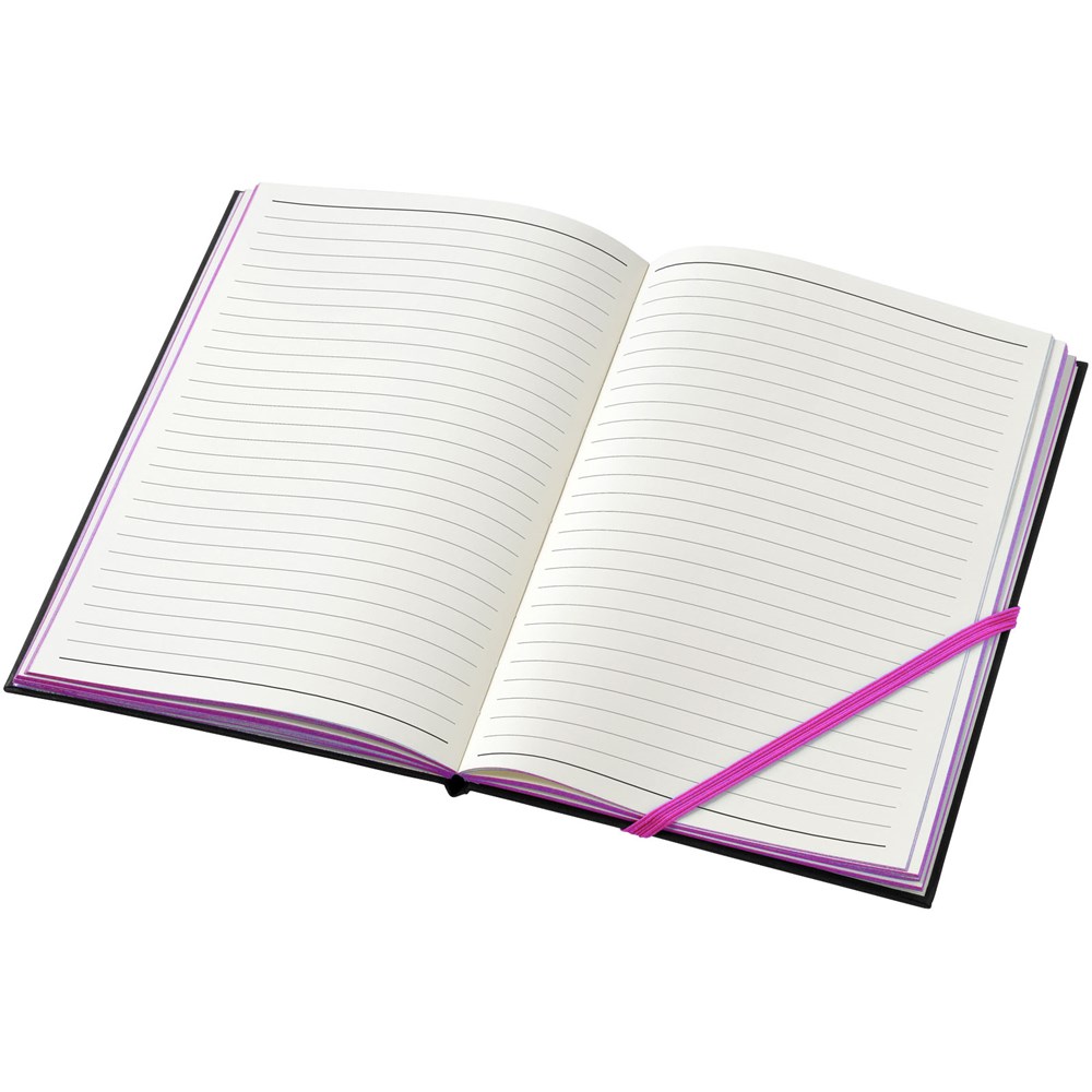 A5 Notizbuch mit 80 Blatt beigem Papier (70 g/m²) und diagonalem Gummibandverschluss und Kanten in auffallenden Neonfarben.