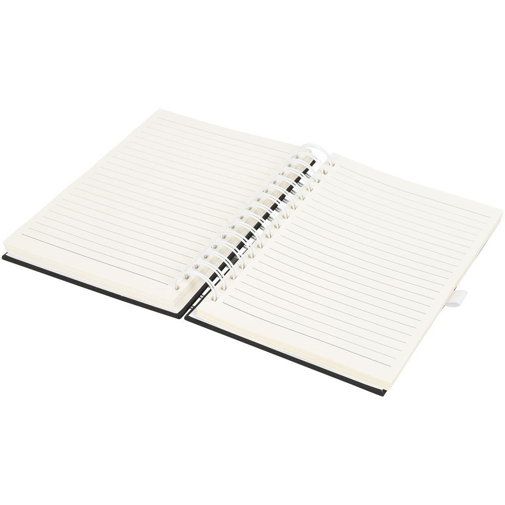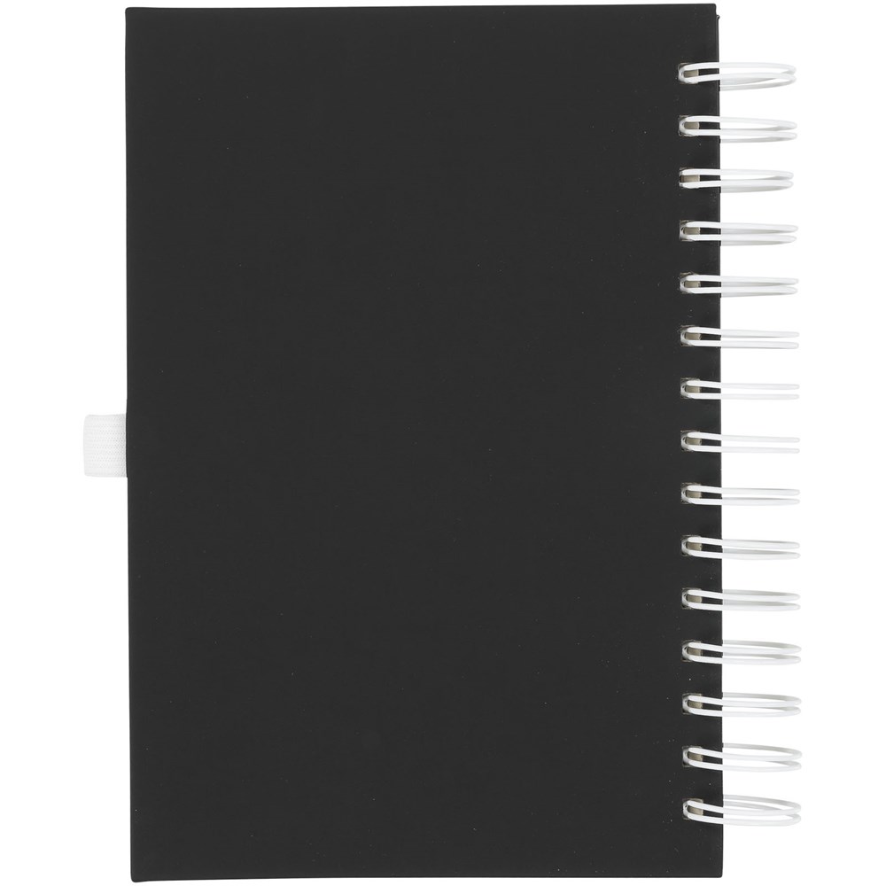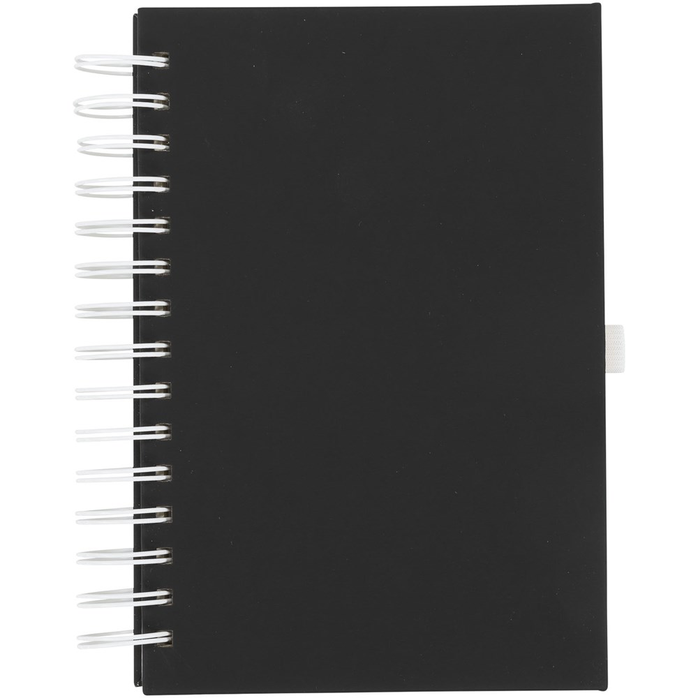 Eine Neuheit in unserem beliebten Notizbuchsortiment. Dieses vielseitige neue Notizbuch hat einen glatten schwarzen PU-Einband mit Spiraldraht in kräftigen Farben und passender Stiftschlaufe. Mit 160 Blatt (70 g/m²) cremefarbigem liniertem Papier.