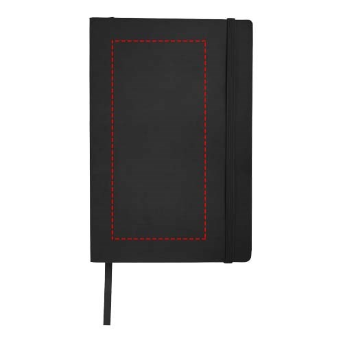 Softcover Notizbuch (A5 Format) mit integriertem Gummibandverschluss, Leseband, Dokumentenfach an der Rückseite innen und 80 Blatt (80 g) liniertem Papier.