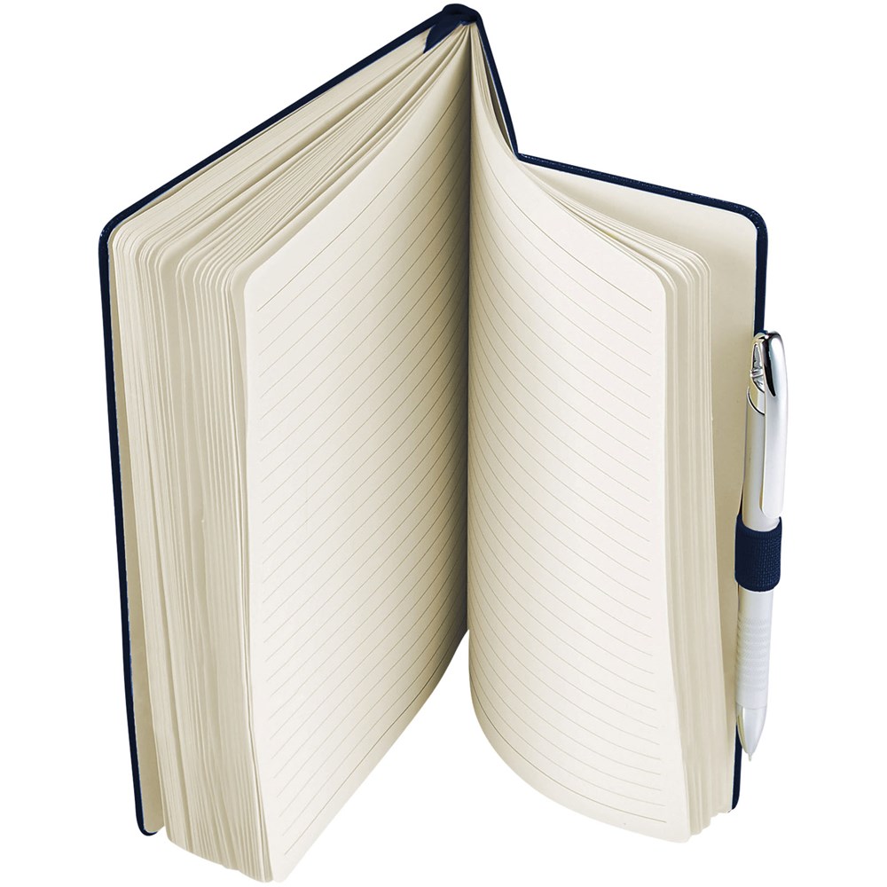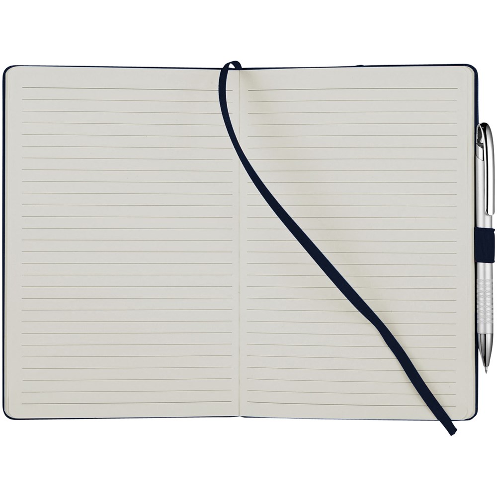 A5 Notizbuch mit rückseitiger Falte für einfaches Umblättern. Inklusive Gummiband zum Verschließen, Leseband und 80 Blatt (80 g), liniertem Papier.