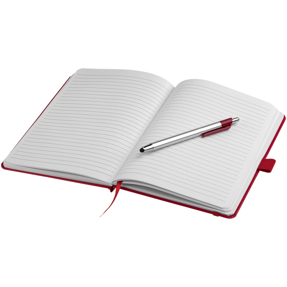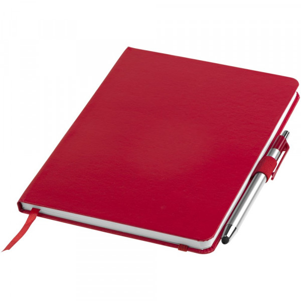 Gebundenes Notizbuch mit Gummibandverschluss und Leseband in passender Farbe. Mit Stylus Kugelschreiber aus Kunststoff und 80 Blatt (70 g/m²).