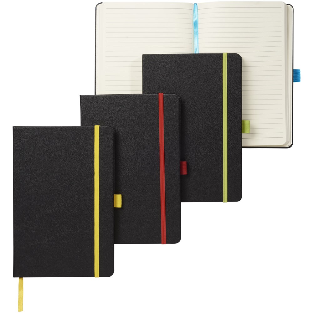 Das gebundene Notizbuch im A5-Format zeigt Ihr Logo oder Ihre Marke in blau, rot, grün oder gelb nach einer Lasergravur. Inklusive einem farblich passenden elastischen Verschluss, einem Band-Lesezeichen und einer elastische Stiftschlaufe. 80 g/m², 80 Blatt cremefarbenes liniertes Papier. Es verfügt auch über eine erweiterbare Tasche auf der Rückseite, um kleine Notizen zu verstauen. Verpackt in einer Hülle.